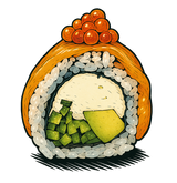 Ryż,nori,serek,ogórek,awokado,łosoś, top kawior czerwony.